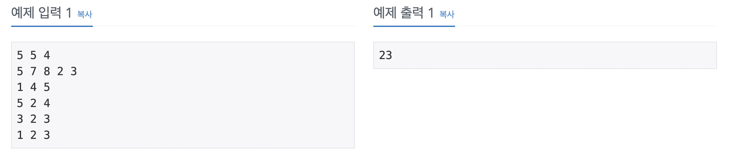 첫째 줄에는 지역의 개수 n (1 ≤ n ≤ 100)과 예은이의 수색범위 m (1 ≤ m ≤ 15), 길의 개수 r (1 ≤ r ≤ 100)이 주어진다.