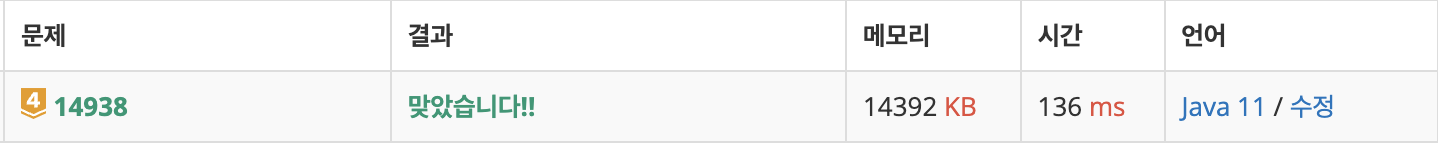 수색범위 내에서 가장 많은 아이템을 먹었을 때의 결과값을 출력해주는 문제이다. 어디에 내려야 가장 많은 아이템을 얻는지 모르니 모든 정점에 대해서 한번씩 시작지점으로 잡고 다익스트라 알고리즘을 돌려주었다. 이 문제는 정점의 개수가 최대 100개기 때문에 플로이드-와샬 알고리즘을 이용해서도 풀 수 있다.