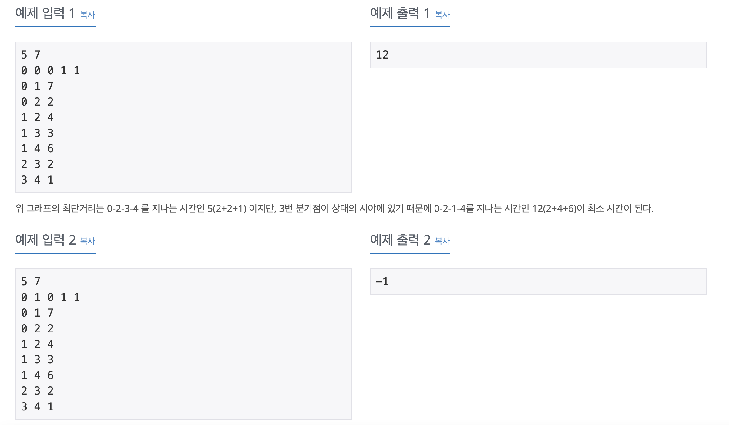 첫 번째 줄에 유섭이의 챔피언이 상대 넥서스까지 안 들키고 가는데 걸리는 최소 시간을 출력한다. 만약 상대 넥서스까지 갈 수 없으면 -1을 출력한다.