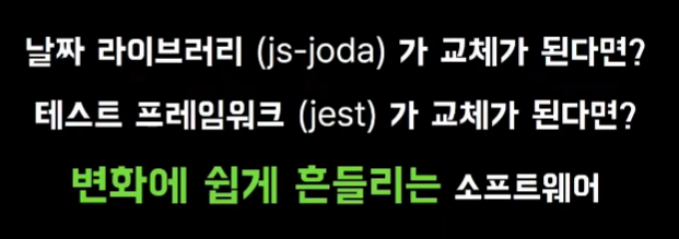 쓰고 있는 라이브러리를 바꾸고 싶은데 테스트 코드를 전부 다 바꿔야 하는 상황이 발생했다. 이것도 어떻게 보면 제어할 수 없는 값인 현재 시간이라는 코드에 함수가 의존하고 있으니 어떻게든 통과시키려고 모킹 해서 발생한 문제가 발생한 것이다. 즉 제어할 수 없는 값에 의존한 문제가 발생한다.