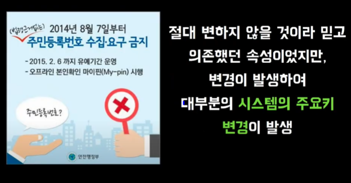 현실세계의 유니크 값인 주민등록번호를 고유 키값으로 사용했던 사례이다. 2014년 8월 7일부터 주민등록번호 수집/요구 금지가 내려져 이 값을 가지고 메인키로 사용했던 회사들은 설계를 다시 바꿔야 하는 상황이 발생하게 되었다.