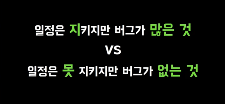 그렇진 않다. 아무리 급한 상황이어도 80~90점짜리 소프트웨어를 일정 내 개발할 수 있는 것이 좋을 것이다.