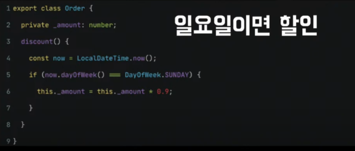 그렇게 되니 discount라는 테스트 코드를 작성하니까 일요일이라는 날짜가 들어오면 모킹이 전혀 필요 없지만 일요일에는 테스트가 성공하는지 토요일에는 실패하는지 검증하는 즉 제어할 수 없는 것에 의존하지 않는 함수가 작성이 된다.