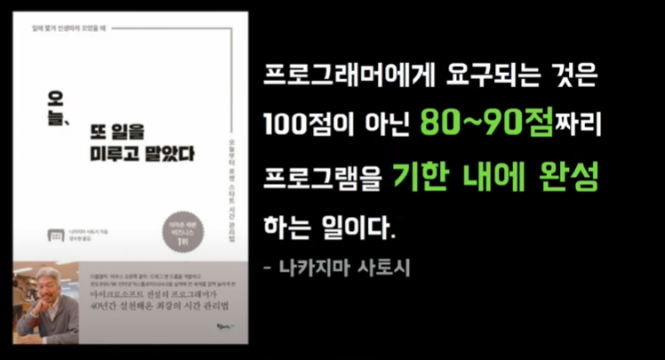 해당 책에서 프로그래머에게 요구되는 것은 100점이 아닌 80~90점짜리 프로그램을 기한 내에 완성하는 일이다. (나카지마 사토시)라고 말한다.