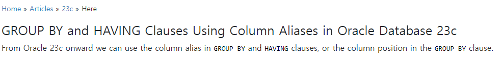 Oracle 23c 이후에는 GROUP BY 및 HAVING , GROUP BY 절의 별칭을 사용할 수 있도록 허용한거같습니다.